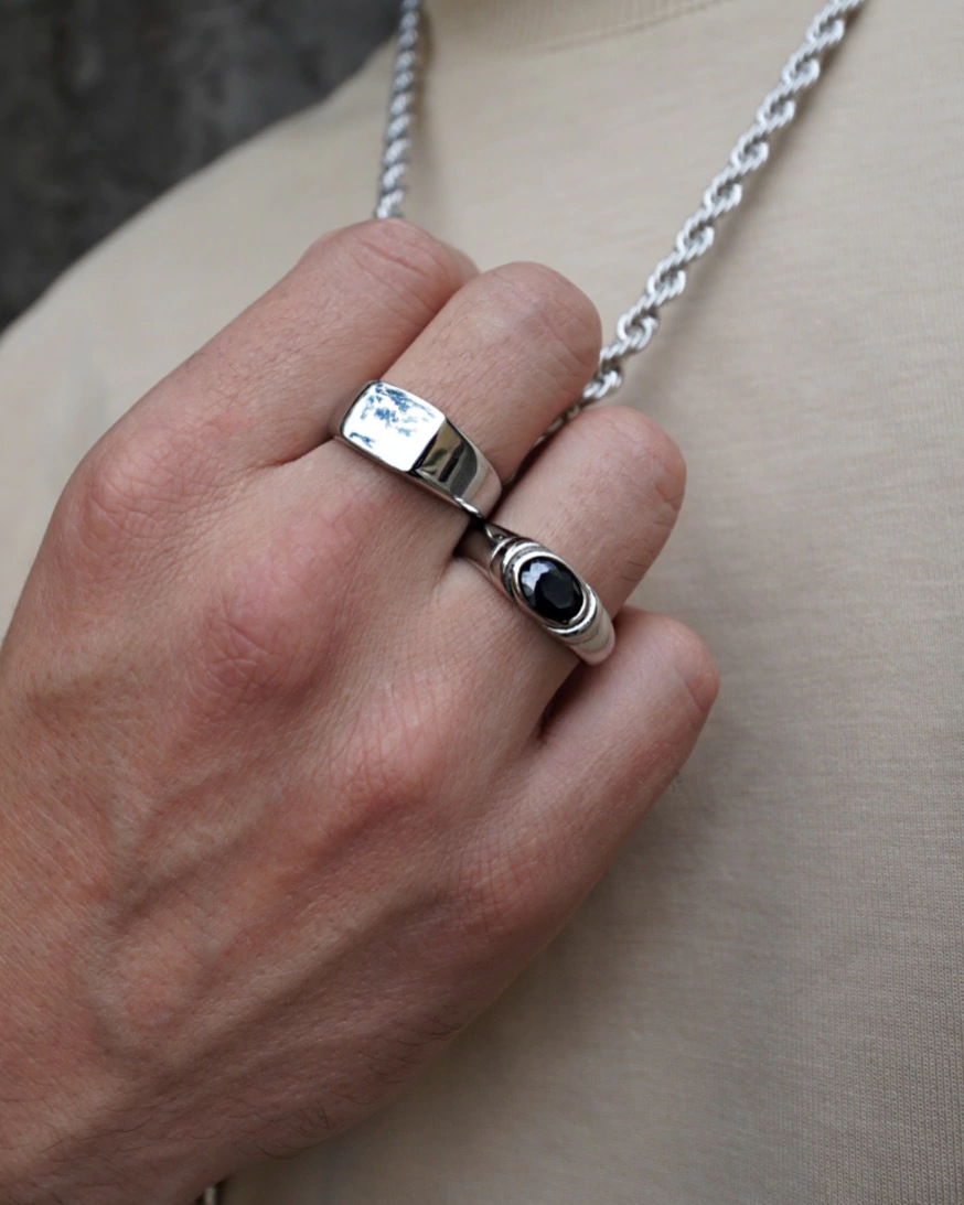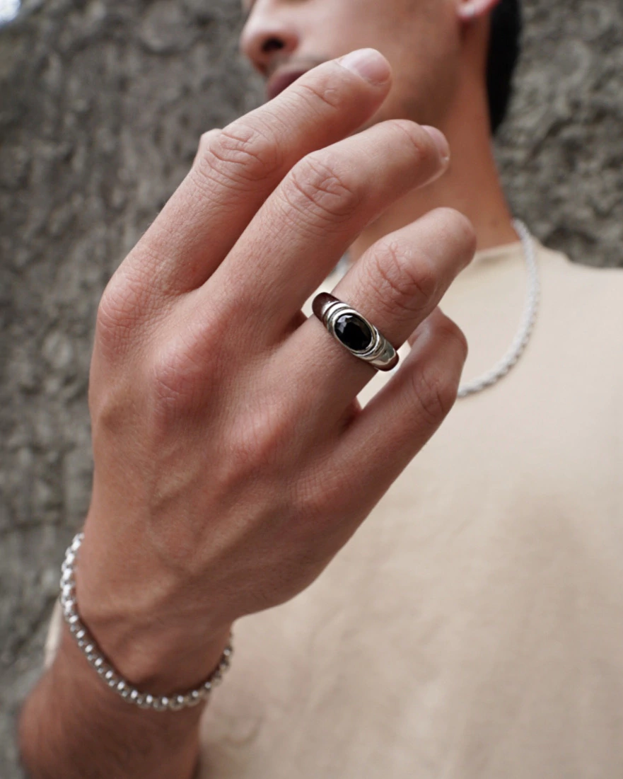 Diseño masizo en acero quirúrgico tipo sello con centro en cristal negro.
