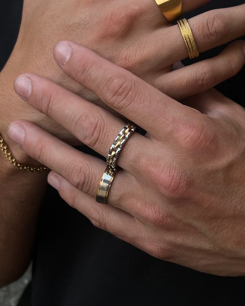 Anillo tipo alianza en acero quirurgico con detalles en oro.