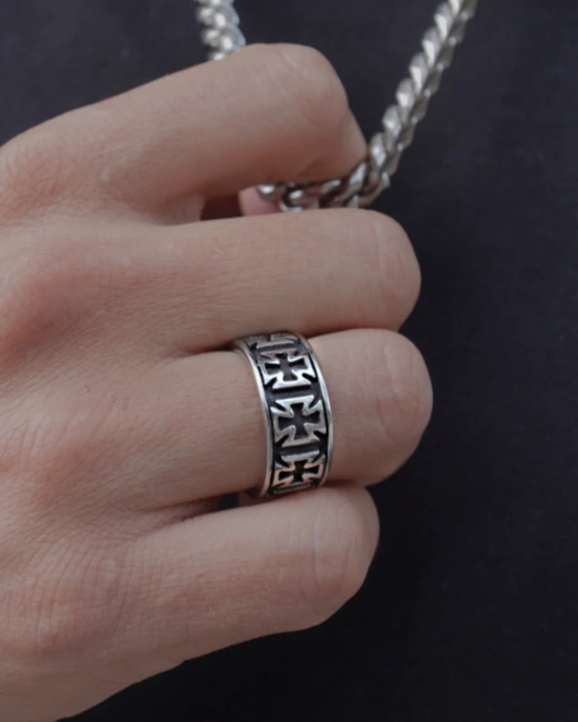 Anilloen acero quirúrgico tipo cinta diseño de cruces.