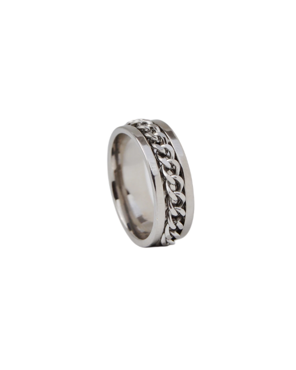 Anillo tipo alianza en acero quirurgico y centro de cadena móvil.