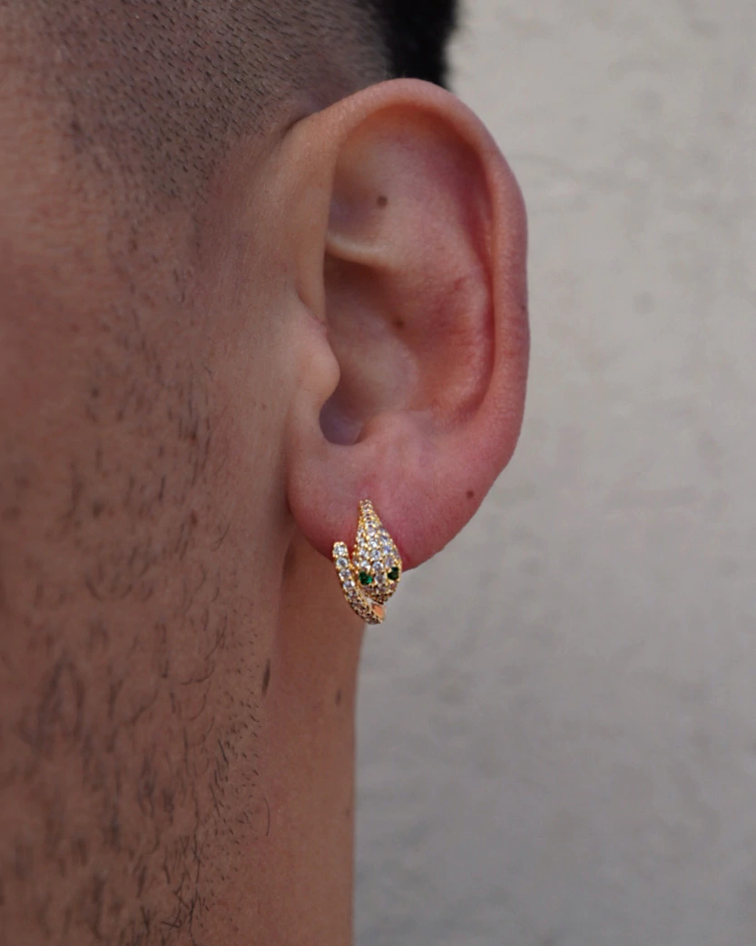 Con diseño detallado, micro circonias en todo su cuerpo y ojos verdes que hipnotizan, esta argolla de 15 mm es puro carácter.