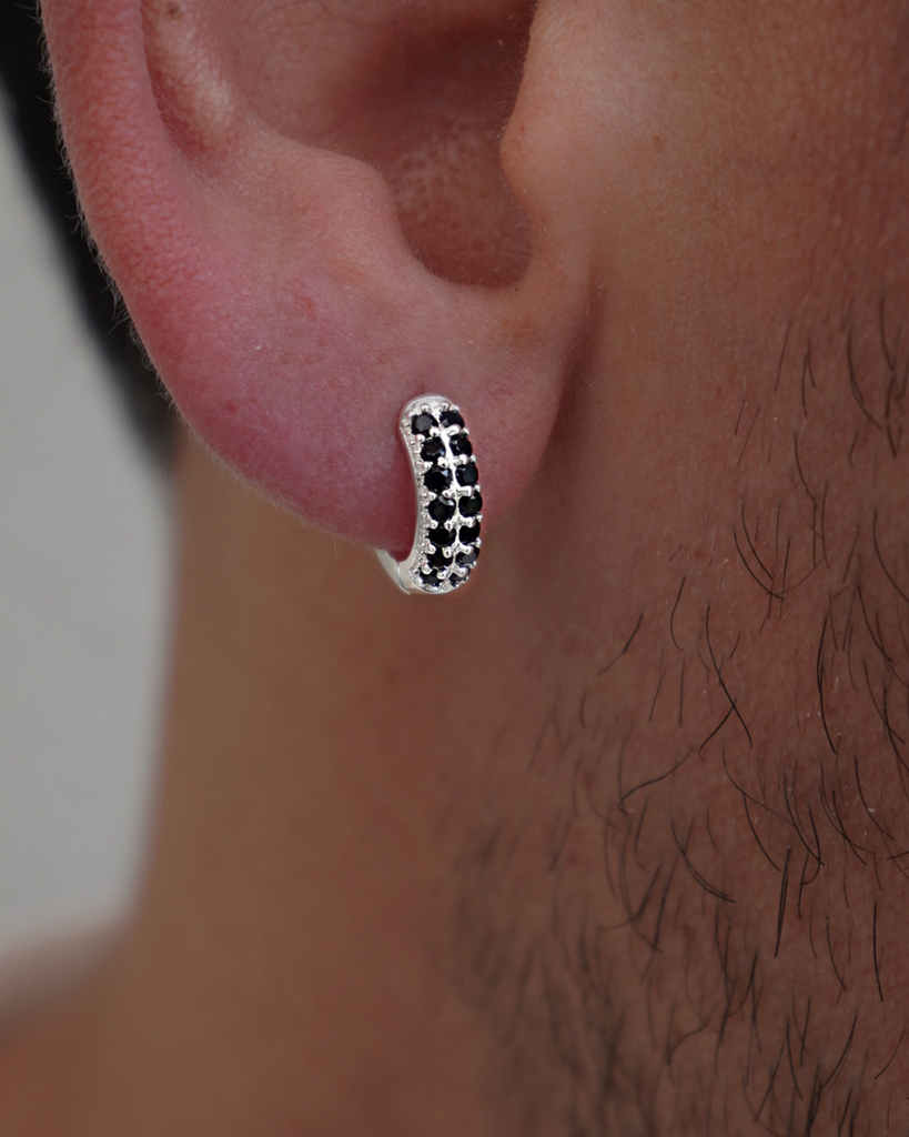 Argolla en bronce con baño en plata recubierto en micro circonias negras en su frente, forma redondeada.