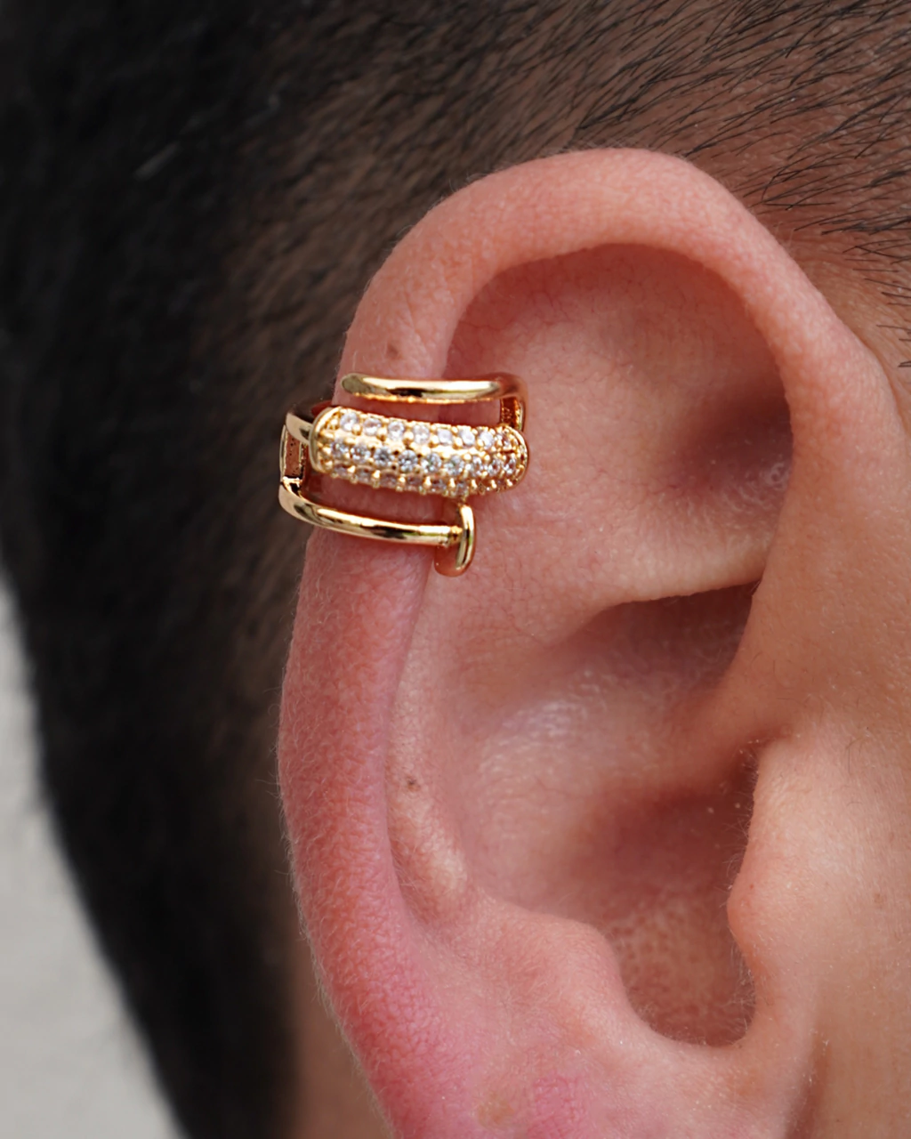 Aro tipo cuff a presión para usar en la media oreja en forma de clavo en cobre bañado en oro y circonias plateadas.