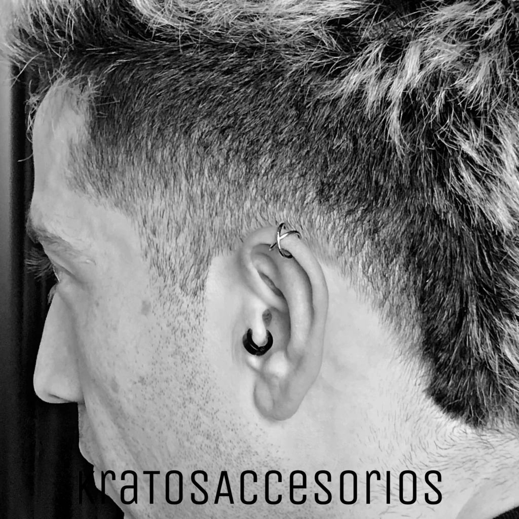 Aro en forma de X a presión en acero quirúrgico plateado.