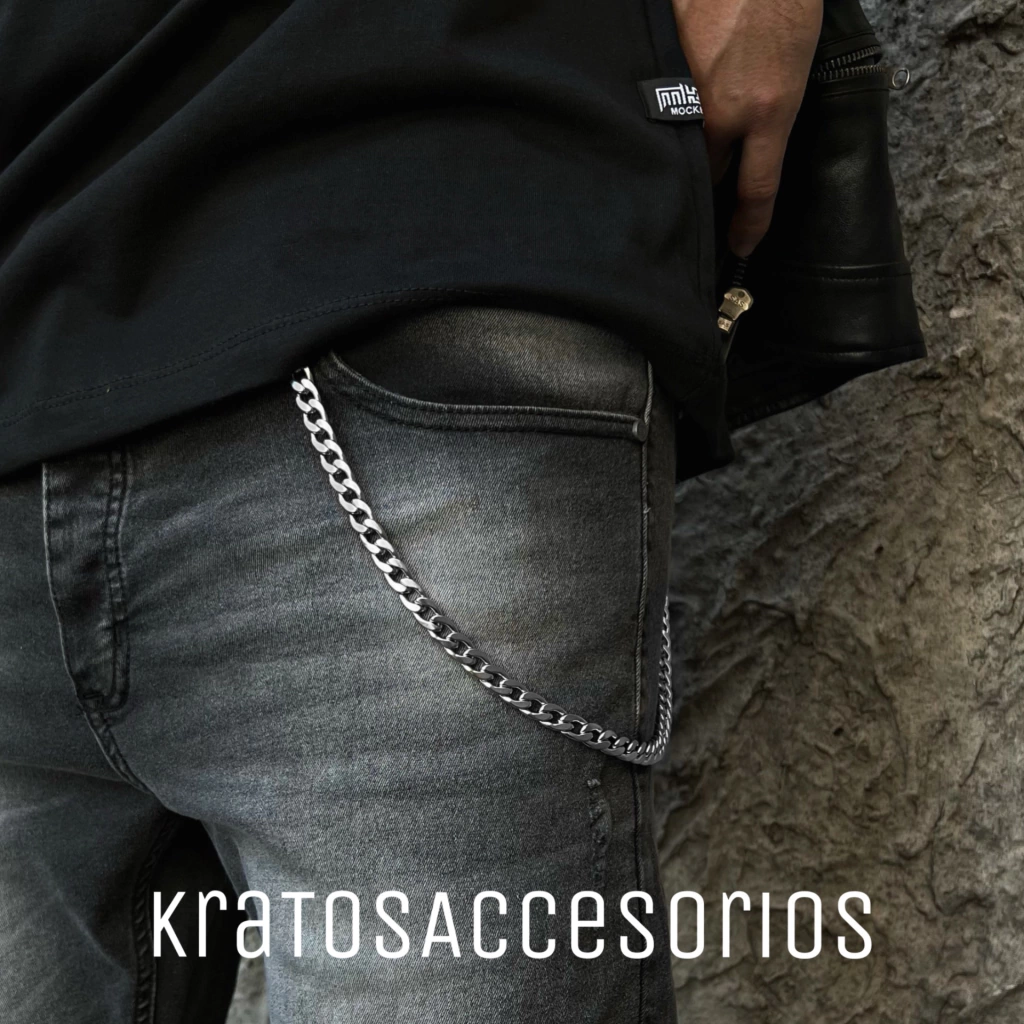 Cadena pantalón de acero quirúrgico plateado estilo cubana plana con doble terminación de mosquetón y argolla porta llaves.