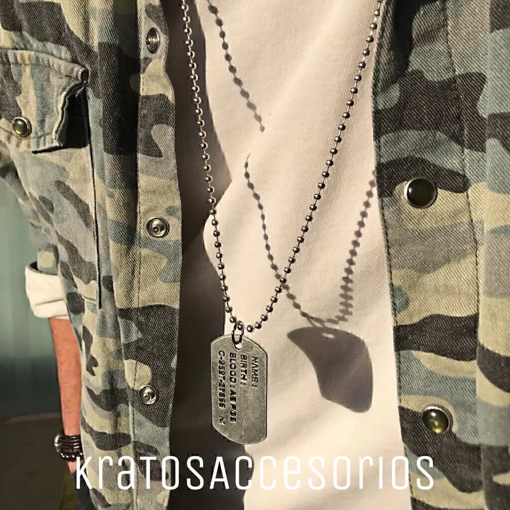 Cadena de bolitas plateada con dije de chapa militar en fundición de metal tono plata opaca.
