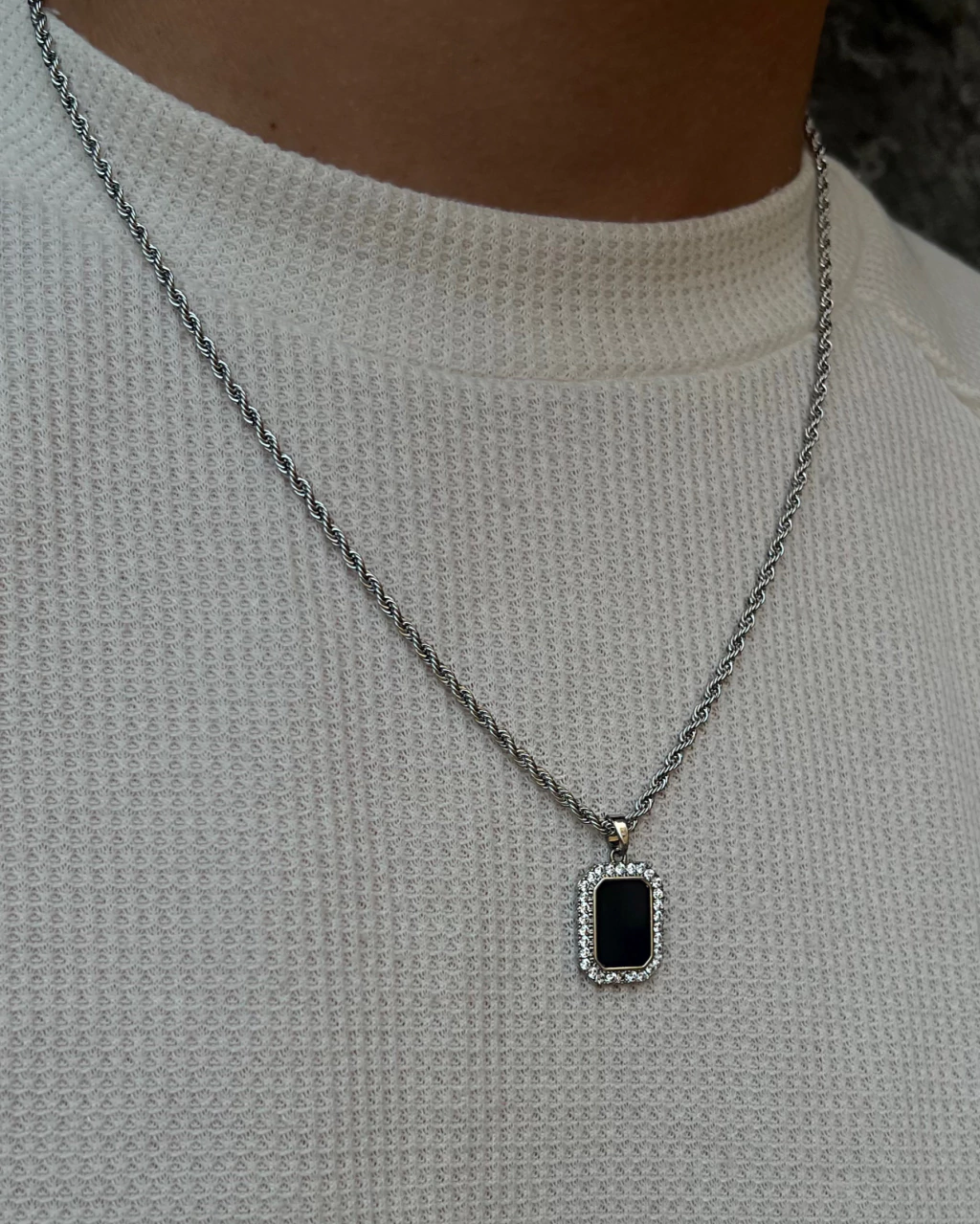 Cadena torzada de 55 cm de largo y 2 mm de espesor en acero quirúrgico.