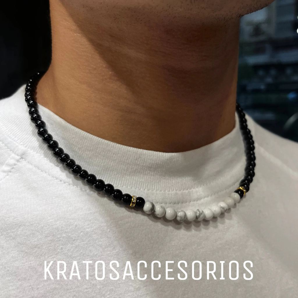 Es en piedra natural howlita blanca y ónix de 6mm de diametro.