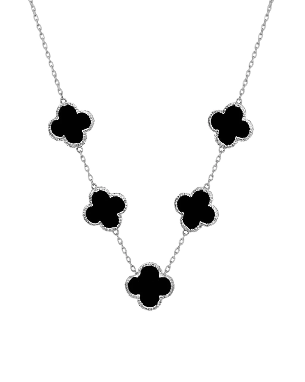 Los cinco dijes de trébol en cristal negro representan protección, foco y energía contenida, colgando de una cadena dorada en acero quirúrgico enchapado en oro 14k.