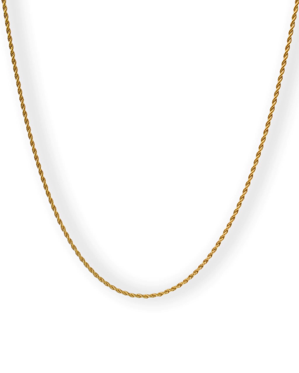 Cadena torzada tipo tubrillon fina en acero quirúrgico de 50 cm de largo enchapado en oro de 14k. Resistente al agua.