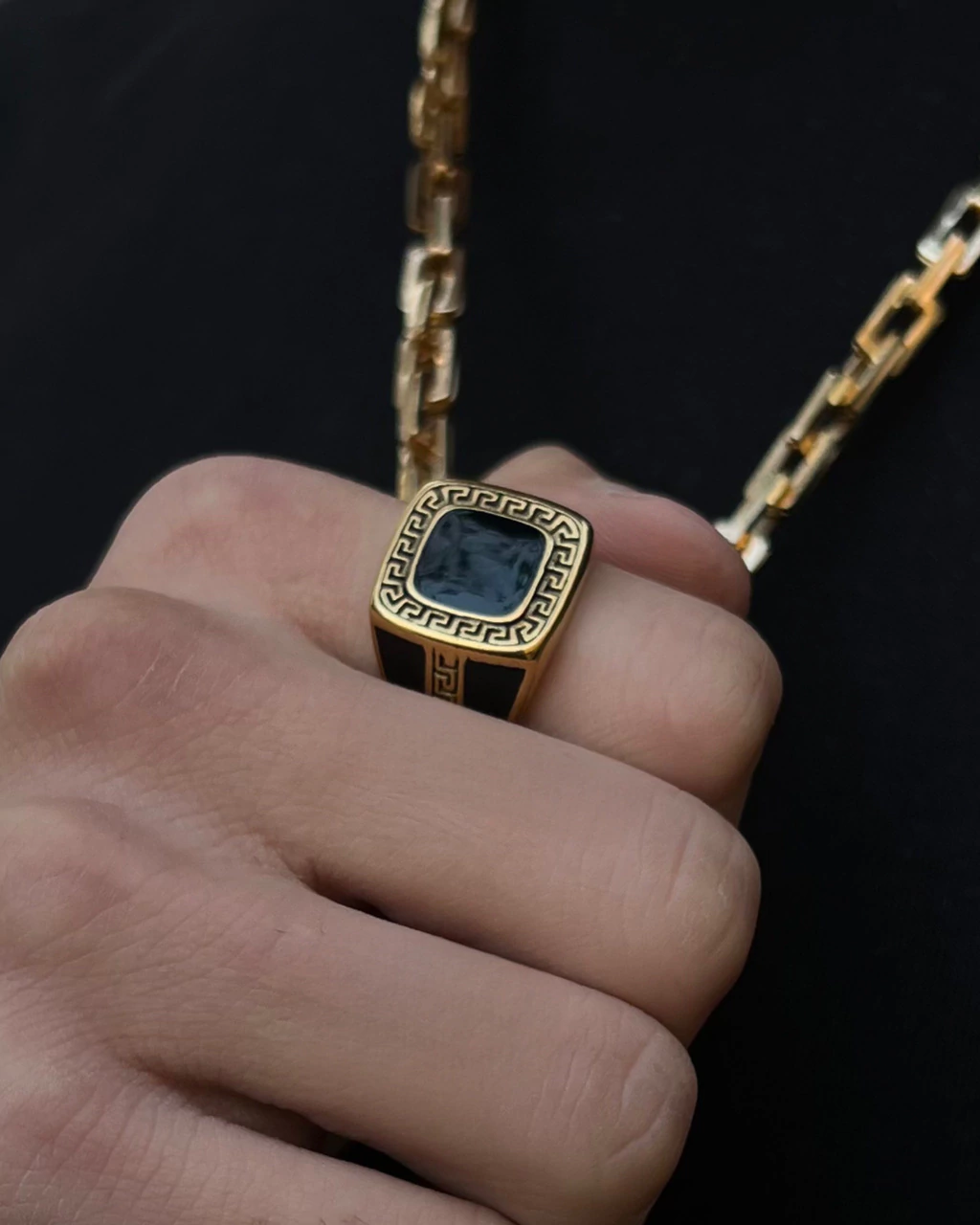 Anillo Marco: de centro negro con dibujos tallados a los lados en acero quirúrgico enchapado en oro de 14k.