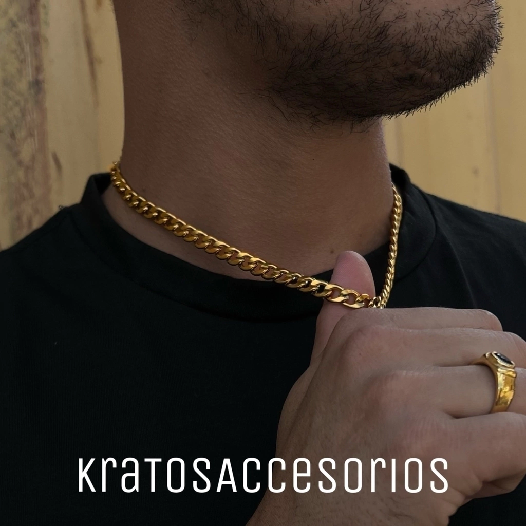 Pulsera Cuba: brazalete disponible del talle S al XXL. Collar Steel Chain: cadena disponible en versión de 50 cm de longitud y de 60 cm de longitud.