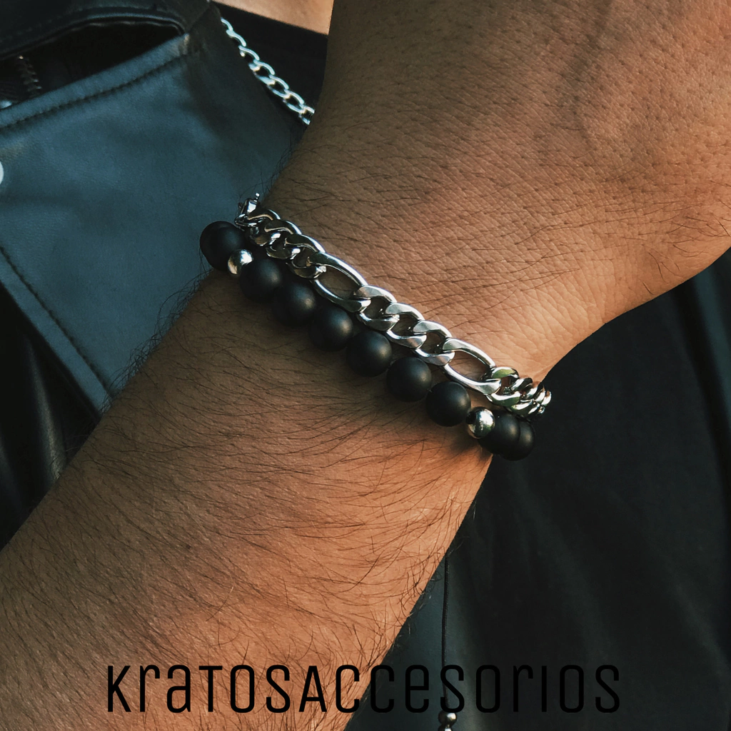 Simple black: piedra natural ónix mate de 8mm de espesor y dos bolitas de acero quirúrgico de 6mm regulable a todos los talles en hilo de neopreno negro.