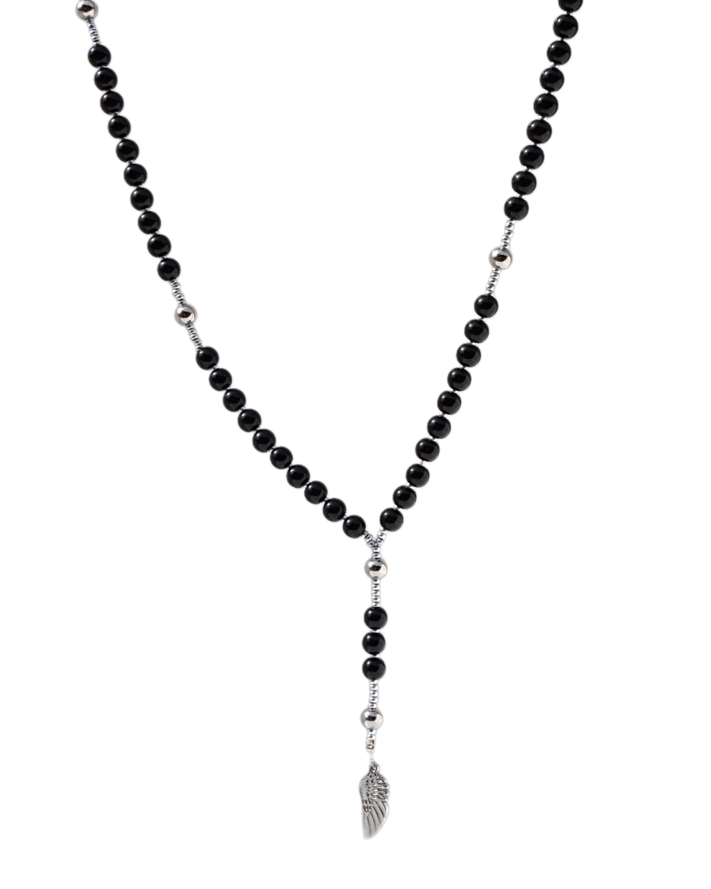 Rosario fino y elegante en ónix negro y acero quirúrgico 316L con dije de ala.Tiene un largo de circunferencia 50 cm. Parte colgante aprox 8 cm. Tamaño del dije ala 20 x 7 mm.